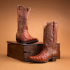 This little lady will be the center of attention. A gorgeous Caiman tail vamp is topped off with a stitched twelve inch calfskin shaft and highlighted with decorative studding. KELLI kicks things off with a snip toe in Midnight black or Chocolate brown choices. Every step is a statement!